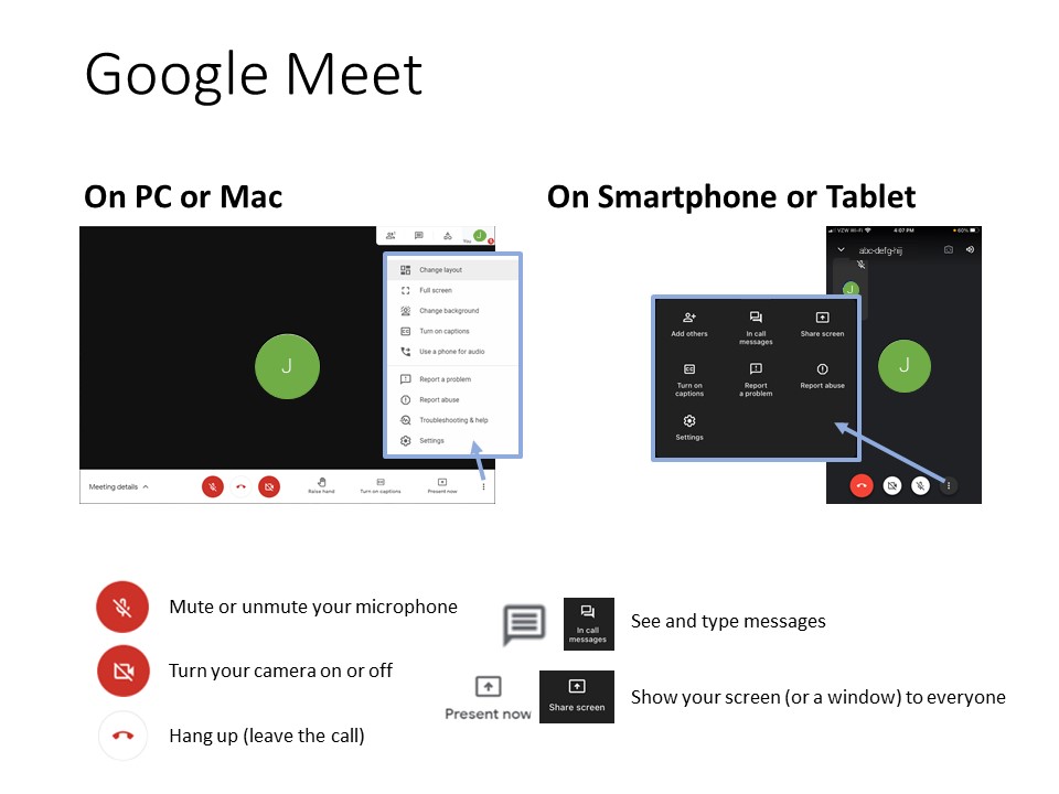 On a computer, smartphone, or tablet, you may choose to use your camera (if available) so others can see you and to share your screen so others can see it. See the image below for more details.