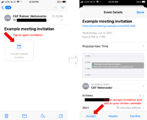 On an Apple iPhone/iPad or Android phone/tablet, you will join using the free mobile app – download it here. Tap the link in the meeting invitation to join. (You may need to then tap an Open button if a web page shows.)