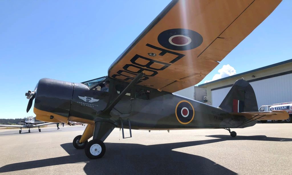 Our aircraft is a 1944 AT-19, built by the Stinson division of the Consolidated Vultee Corporation as a military advanced trainer. Approximately 500 AT-19s were provided to the United Kingdom through the Lend-Lease program. The UK Royal Navy Fleet Air Arm operated AT-19s under the name Reliant I for training, communications, and transportation. Our aircraft, designated as FB605, is painted in honor of our British allies who flew it in the South-East Asian theater.
